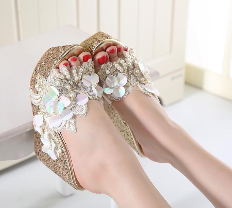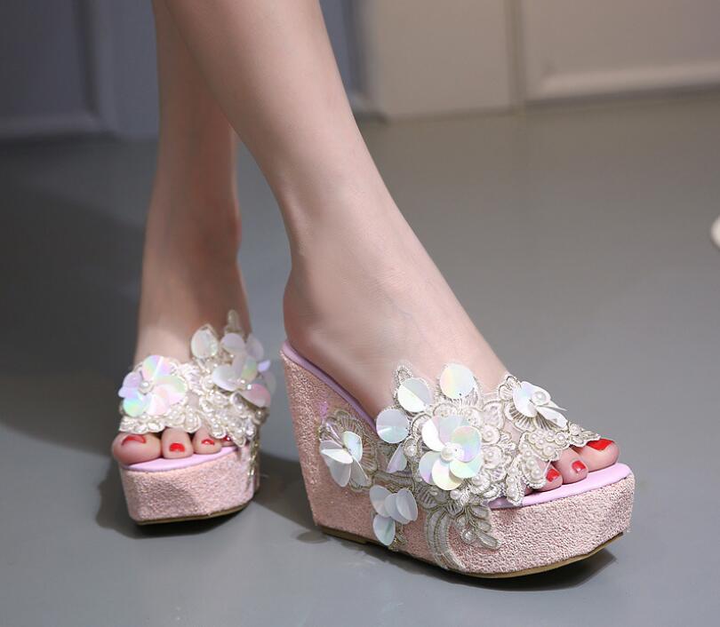Women's sandals sweet beaded flowers transparent wedges slippers women