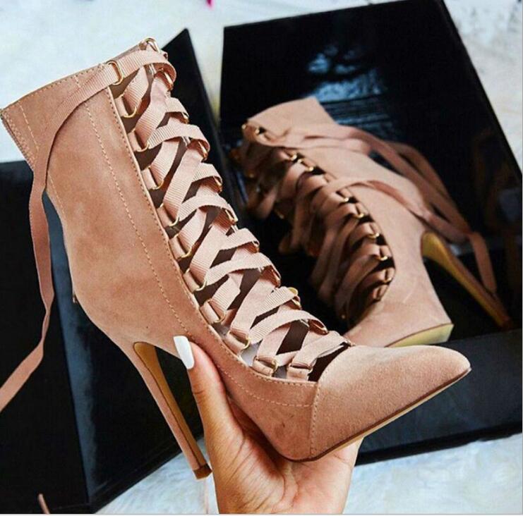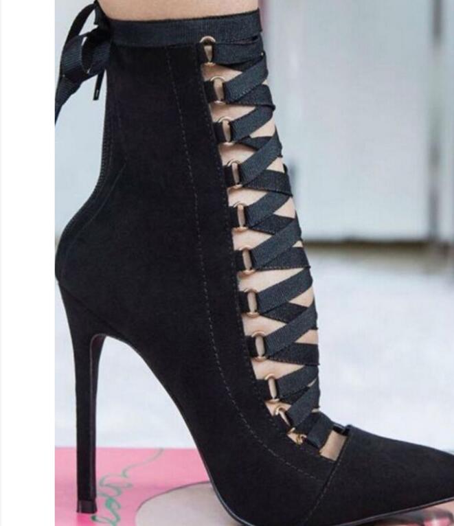 Punk Ankle Gladiator Short Boots Strappy Lace Up Pointed Toe Stilettos Women Sandals Pumps6