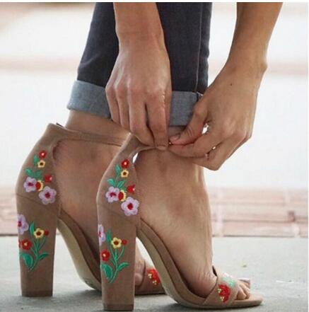 Europe and The United States New Fashion Ankle Strap Floral Embroidered Chunky High Heels