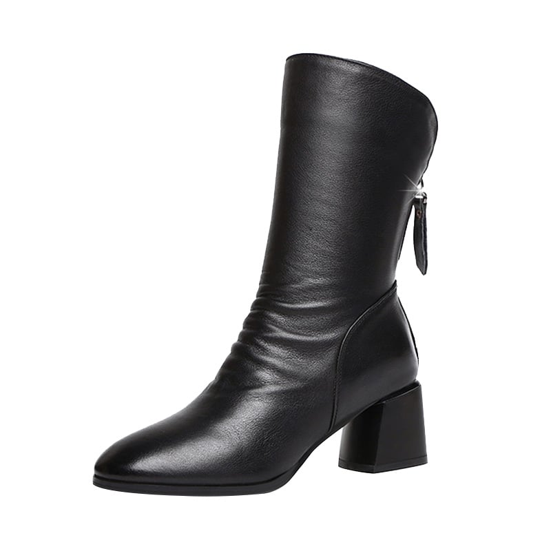 New Women's Leather Boots Thick Heel Black And Velvet British Style High Heel Boots