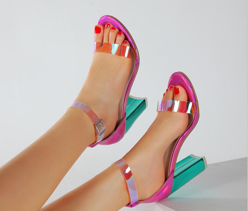Elegant one-word buckle round toe thick high-heeled sandals Large size solid color women's shoes