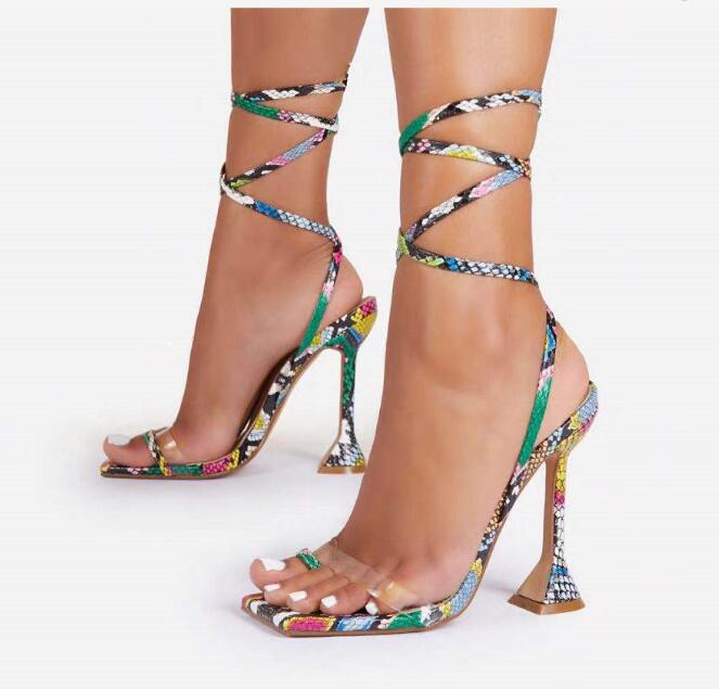 New snake print Roman flip flops lace-up wine glass high-heeled women's shoes