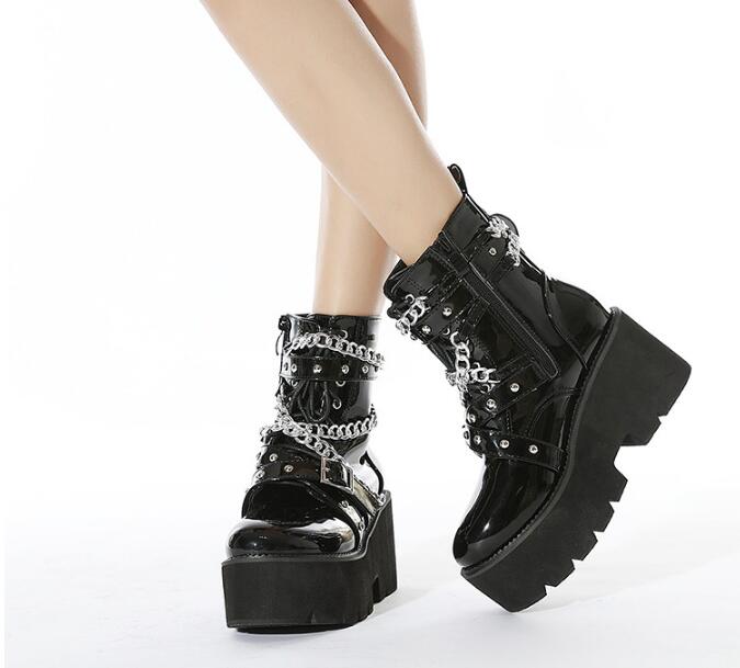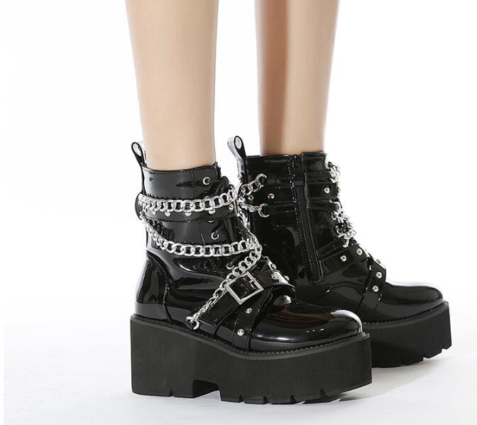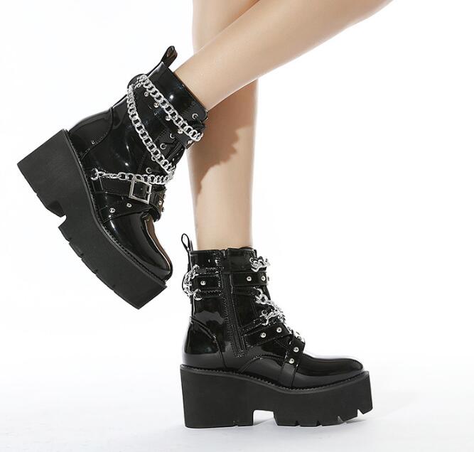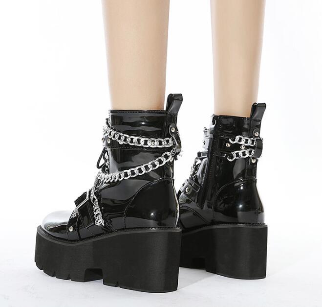 Platform Wedge Heel Short Boots Trifle Metal Chain Front Lace-up Martin Boots
