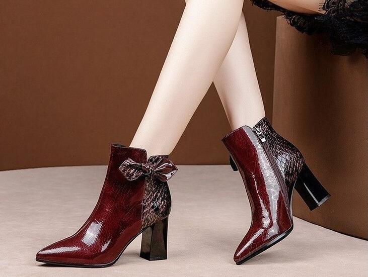 New thick-heel Martin boots wine red single boots bow-knot pointed toe women's shoes