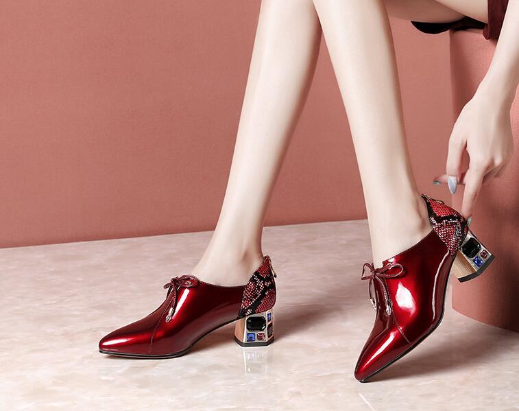 Pointed toe lace-up burgundy deep mid-heel women's shoes with thick heels