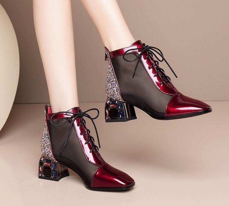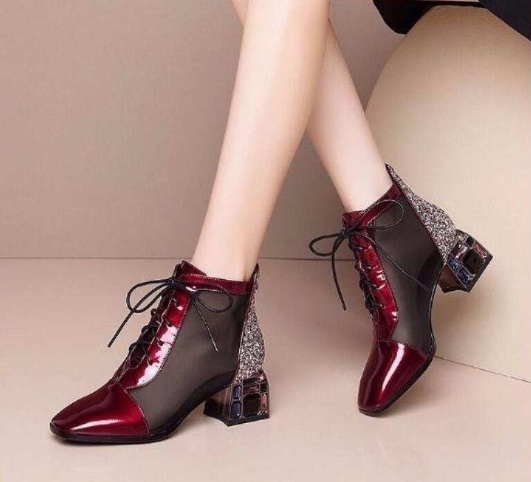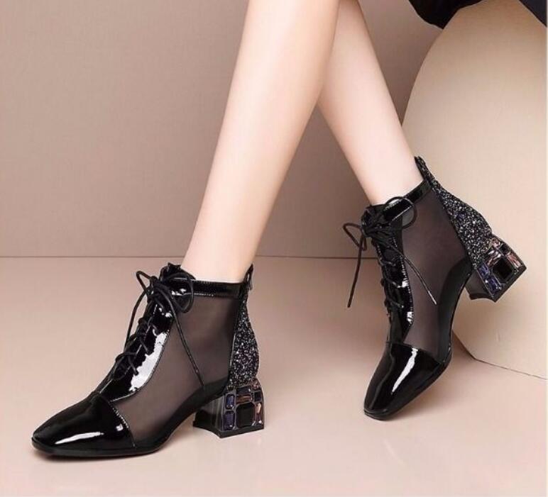 New style net boots women's Baotou sandals mid-heel rhinestone lace-up women's shoes