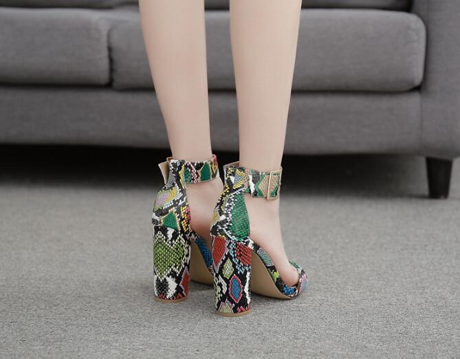 Sexy thick-heeled women's shoes with colorful snake print and high-heeled sandals
