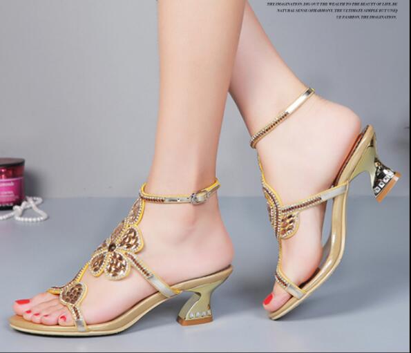 Rhinestone open toe comfortable mid-heel buckle women's shoes