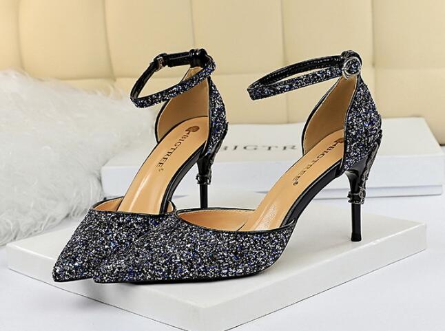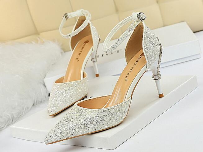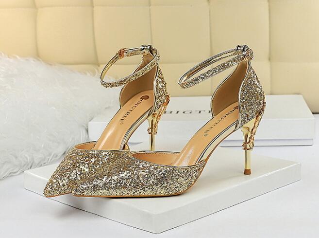 Metal decorative shallow mouth pointed sequins word with hollowed out women's shoes