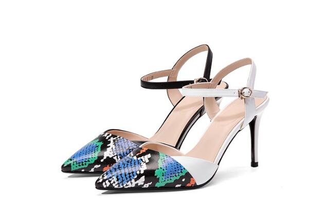 Sexy and elegant snake print color matching pointed toe women's shoes with back space