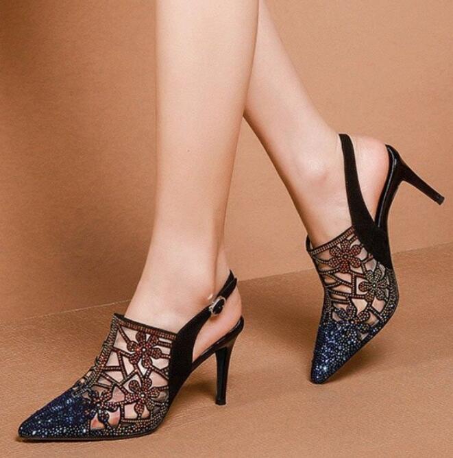 Pointed toe rhinestone shoes one word buckle women's shoes