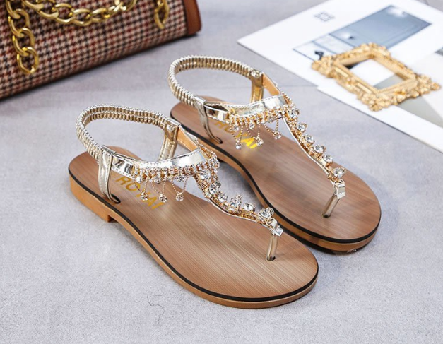 Square heel thong beaded summer new rhinestone low-heeled women's sandals