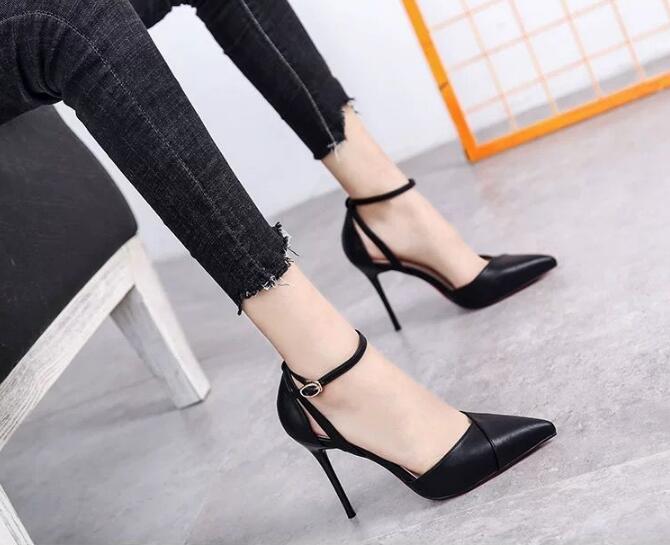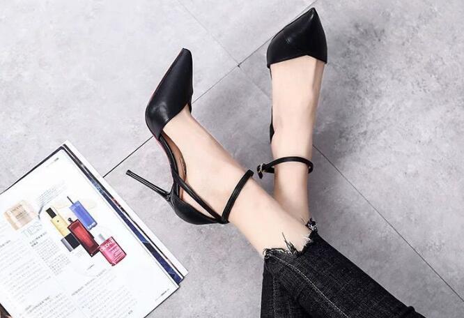 Sexy shallow mouth black shoes with a buckle and pointed toe