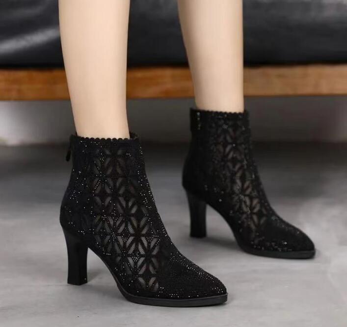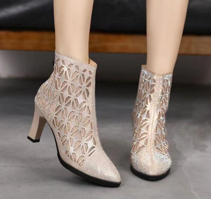 Cut-out pointed-toe rhinestone mesh chunky heel mesh ankle boots